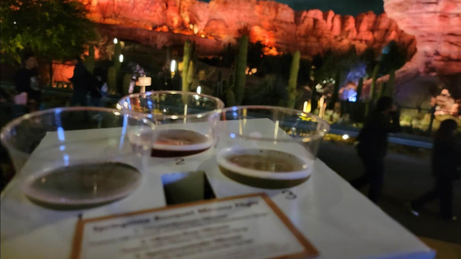 With the park close approaching, the last snacks of the evening were a light, moist Raspberry Almond cake and the Springtime Bouquet Mimosa Flight (Uncork California). Seated by the illuminated Radiator Springs I sipped the Chrysanthemum Mimosa, Hibiscus Rose Mimosa and Apricot Lavender Mimosa.