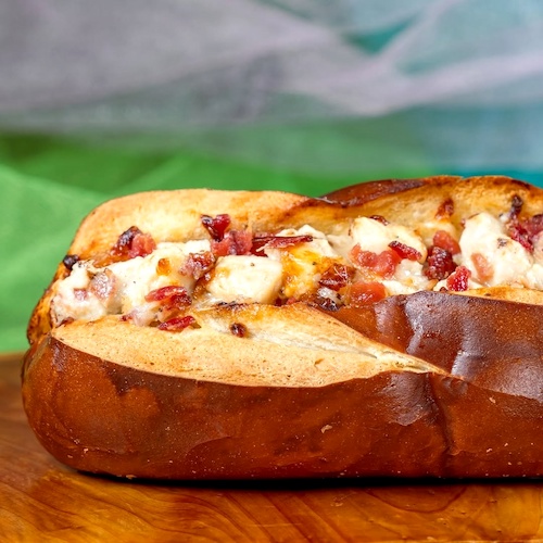 - Chicken-Bacon Cheesy Garlic Pretzel Bread at Edelweiss Snacks and Maurice’s Treats: Chicken and bacon-stuffed cheesy pretzel bread