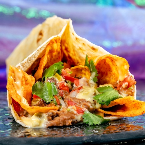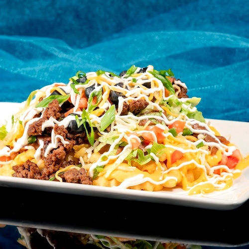 - Loaded Taco Fries at Galactic Grill: Crinkle-cut fries topped with refried beans, seasoned ground beef, spiced cheese sauce, shredded lettuce, tomatoes, olives, green onions, and sour cream drizzle