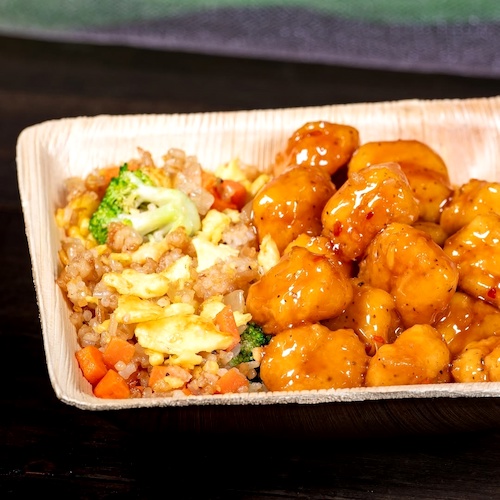- Orange-glazed Chicken Bowl at Bengal Barbecue: Garlic fried rice, scallions, and orange sauce