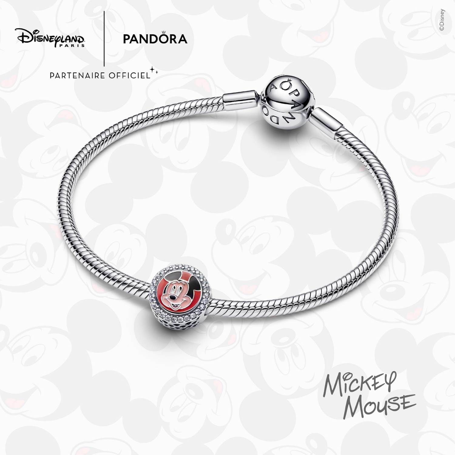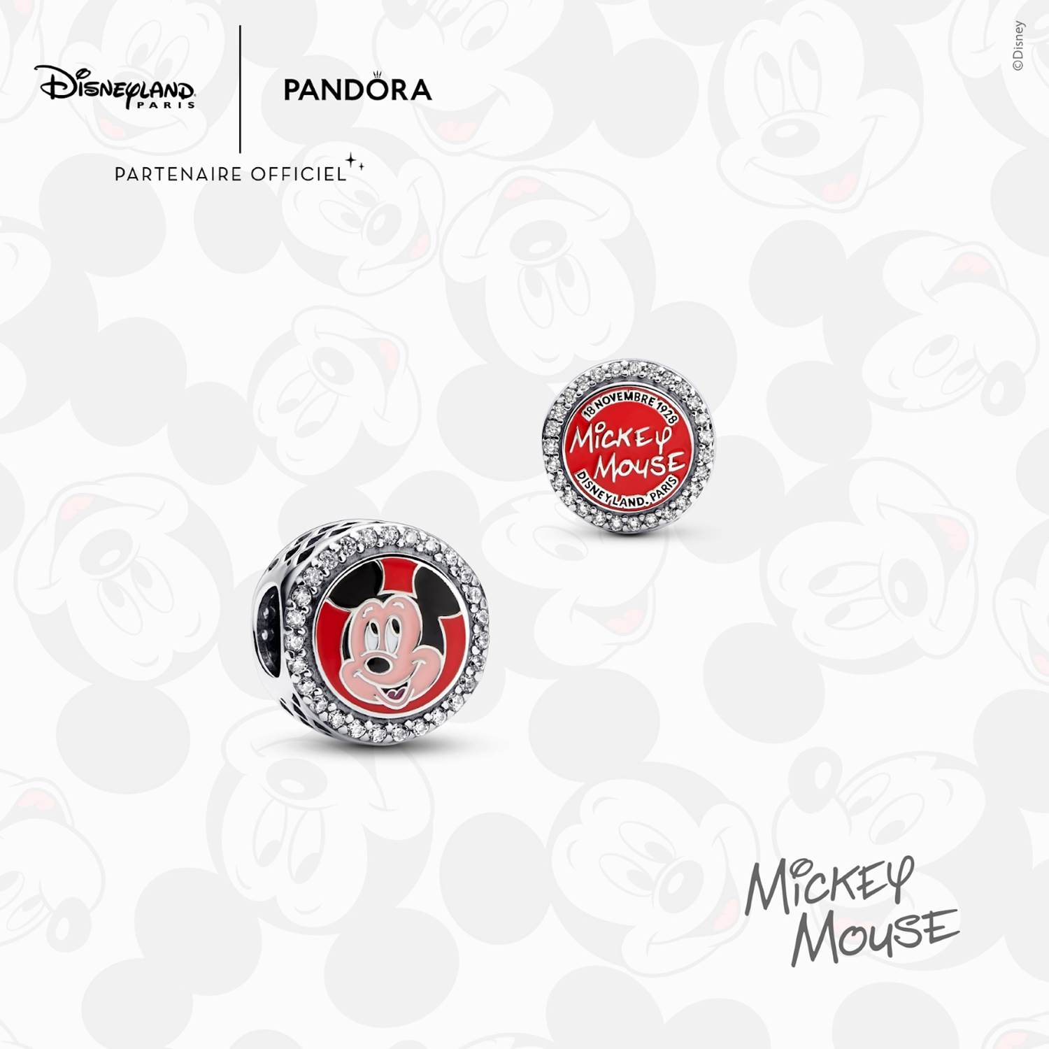 - The new Pandora charm showcases Mickey’s portrait outlined in a gem-encrusted bezel. The other side features the character’s iconic signature, his birthday and Disneyland Paris’s logo.