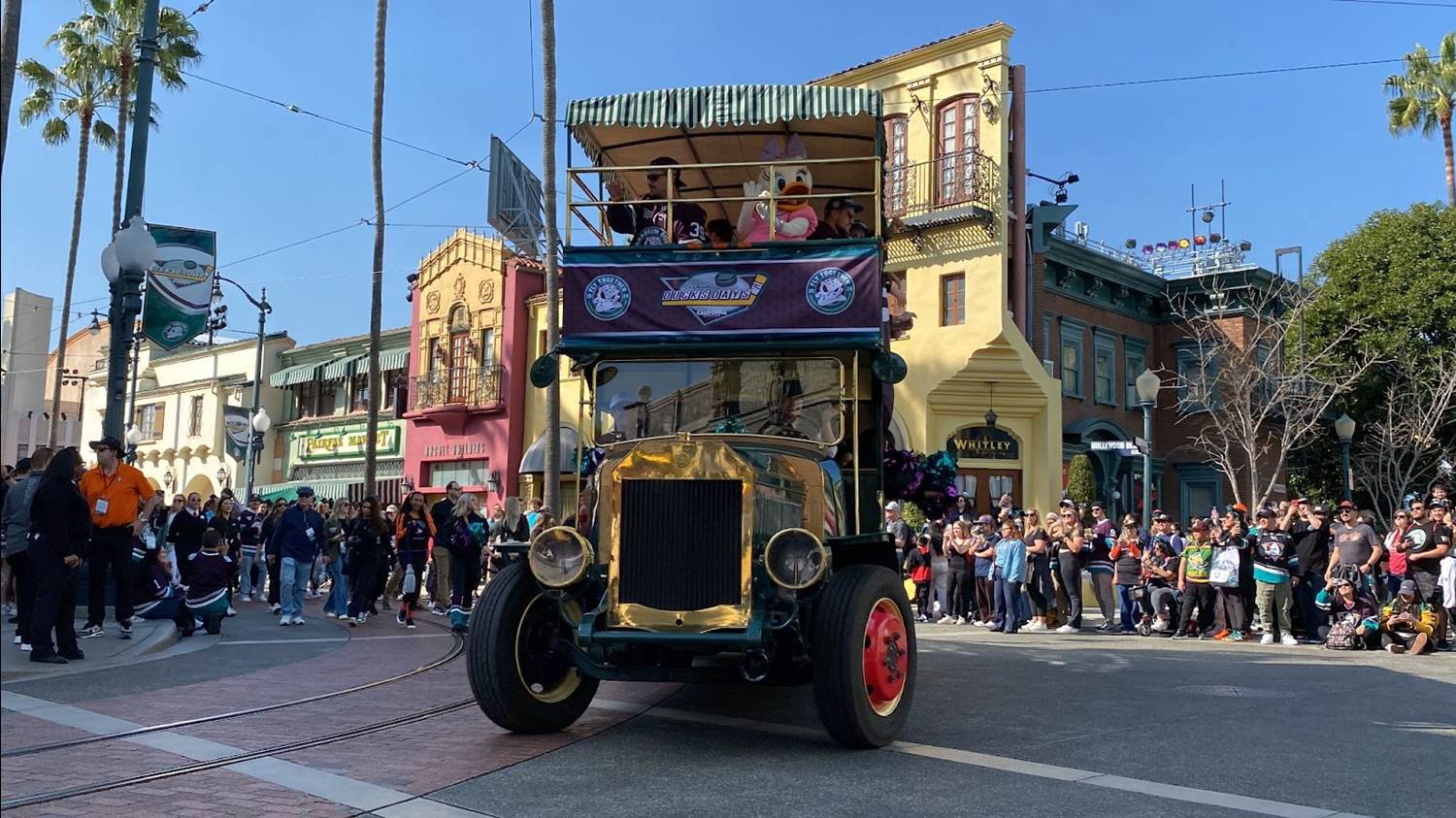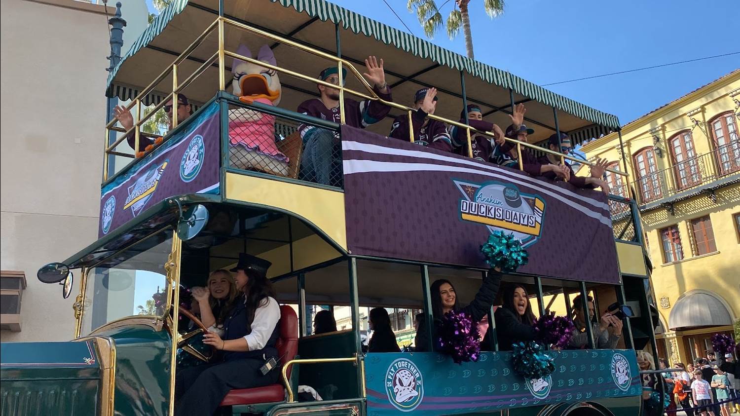 Quack, quack, quack! The NHL’s Anaheim Ducks flocked to the Disneyland Resort today for Anaheim Ducks Day. The special event allowed hockey fans to see their favorite team parade through Disney California Adventure in a special cavalcade.