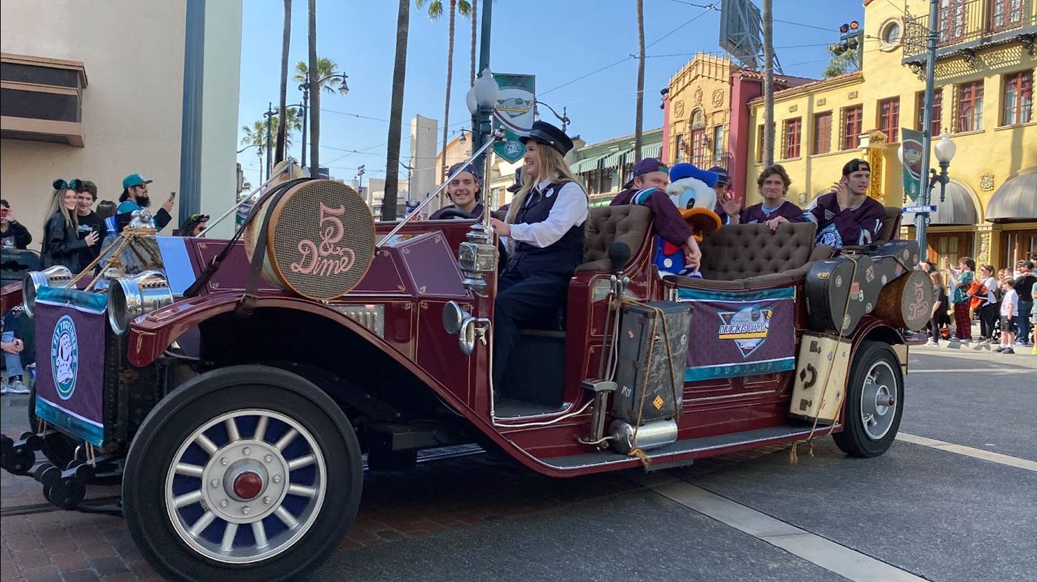 - Guests could pick their spot along the path between Hollywood Land and Paradise Gardens Park to see some current Anaheim Ducks players in this cavalcade to celebrate the special occasion.