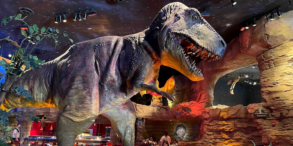 Outside the dining area, young guests can visit the Paleo Zone, a hands-on experience where they dig for hidden dinosaur fossils, pan for treasures in Discovery Creek, and learn more about this extinct empire.