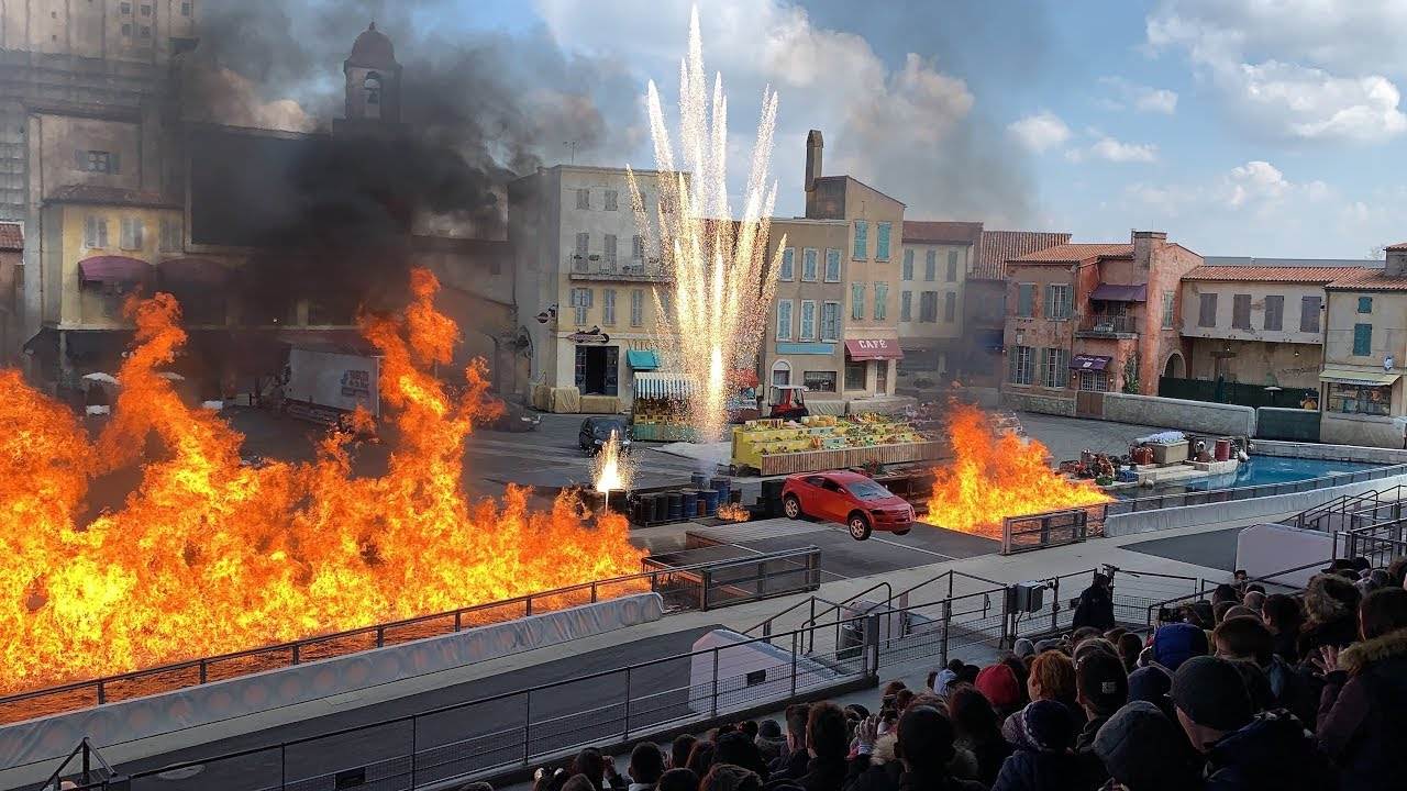 The first thing that stood out when looking at the stage was how big the theater was. In order to have some proper room for the cars to make the stunts realistic, a huge footprint was obviously needed, but things were even more fun because the whole ground was covered in skidmarks, so you knew that some crazy stuff was about to happen. And because it was Disneyland Paris, that action was going to take place in English and French.