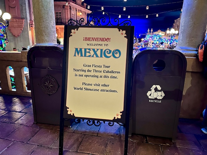 - As guests enter the Mexico pavilion, a sign notes that the attraction is closed, while the signage outside the pavilion is somewhat unceremoniously covered in a black tarp.