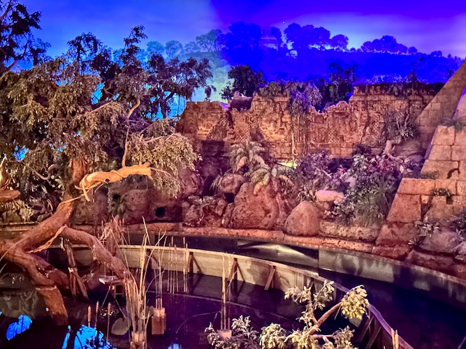 - The water in the attraction has been drained, with work lights turned on everywhere but the first section of the ride, which still features show lighting for guests dining at San Angel Inn.
