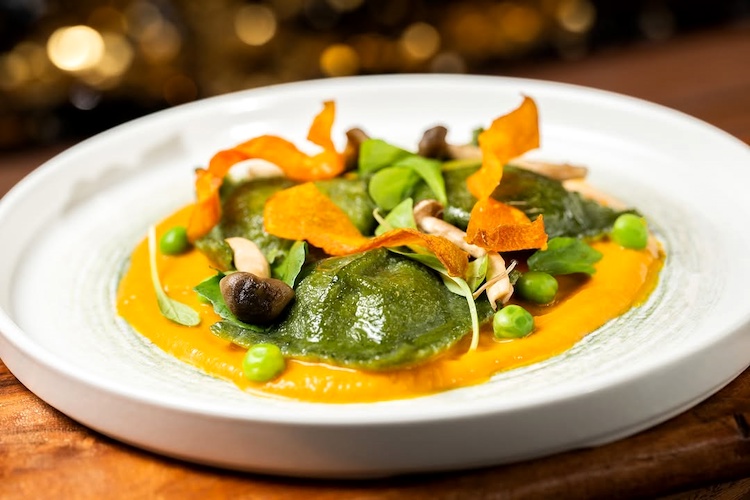 - House-made Ravioli: English peas, carrot purée, and pickled alba mushrooms