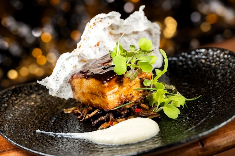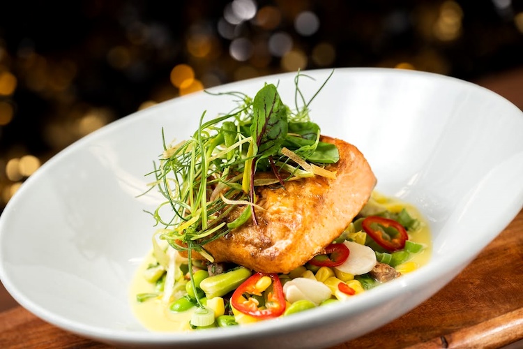 - Grilled Ōra King Salmon: Creamed corn succotash, pancetta, and Spring onion pistou