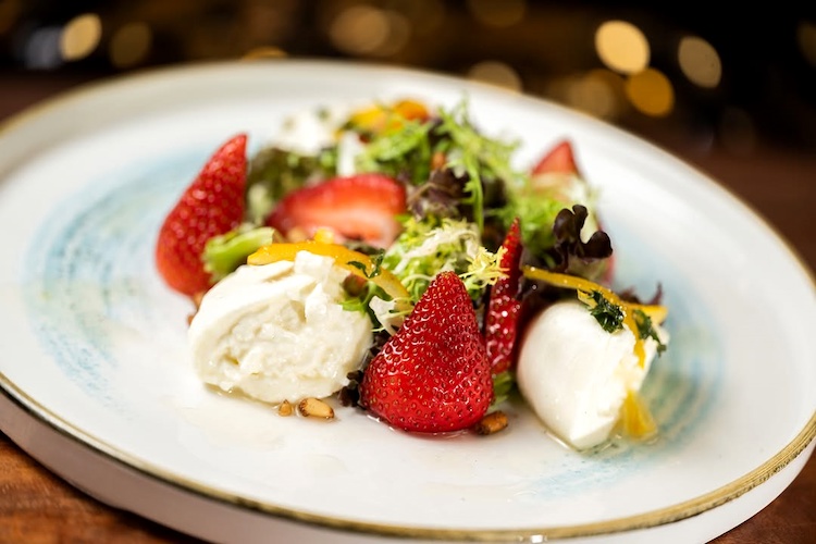 - Grand Marnier Liqueur-macerated Seasonal Fruit Burrata: Lollo rosso, frisée, caramelized spiced pine nuts, and citrus vinaigrette