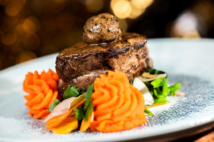 - Filet Mignon: Potato-carrot mash, spicy broccoli rabe, black garlic butter, and madeira demi