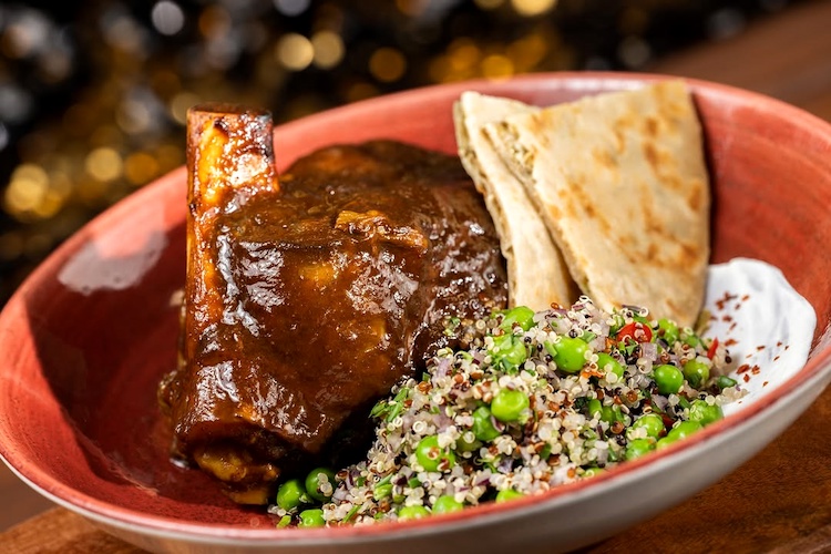 - Lamb Shank: Quinoa-pea salad, paneer paratha chips, and mint yogurt