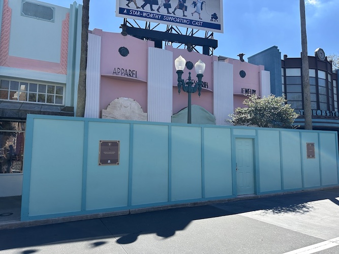 A large wall has appeared on the streets of Hollywood Boulevard, blocking a portion of Keystone Clothiers while work is being done on a doorway and overhang of the popular souvenir shop at Disney’s Hollywood Studios.