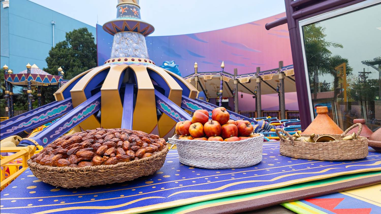 - Meanwhile, the right side features wooden pillars and tables filled with fruit baskets and carpets, echoing the marketplace where Aladdin first meets Princess Jasmine.