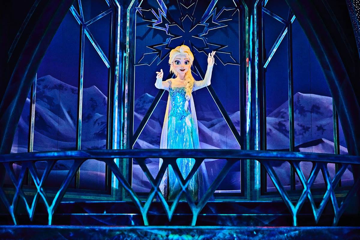 - As with the EPCOT original, guests enter Elsa’s Ice Palace, where she sings her infamous song while your boat switches backwards and proceeds down a small drop.