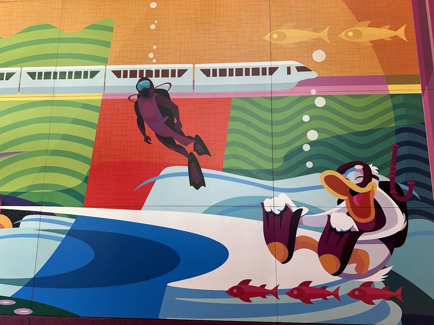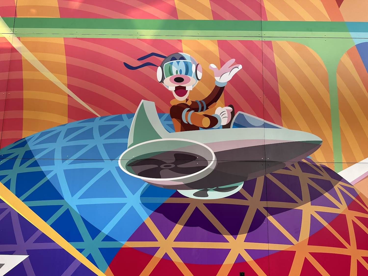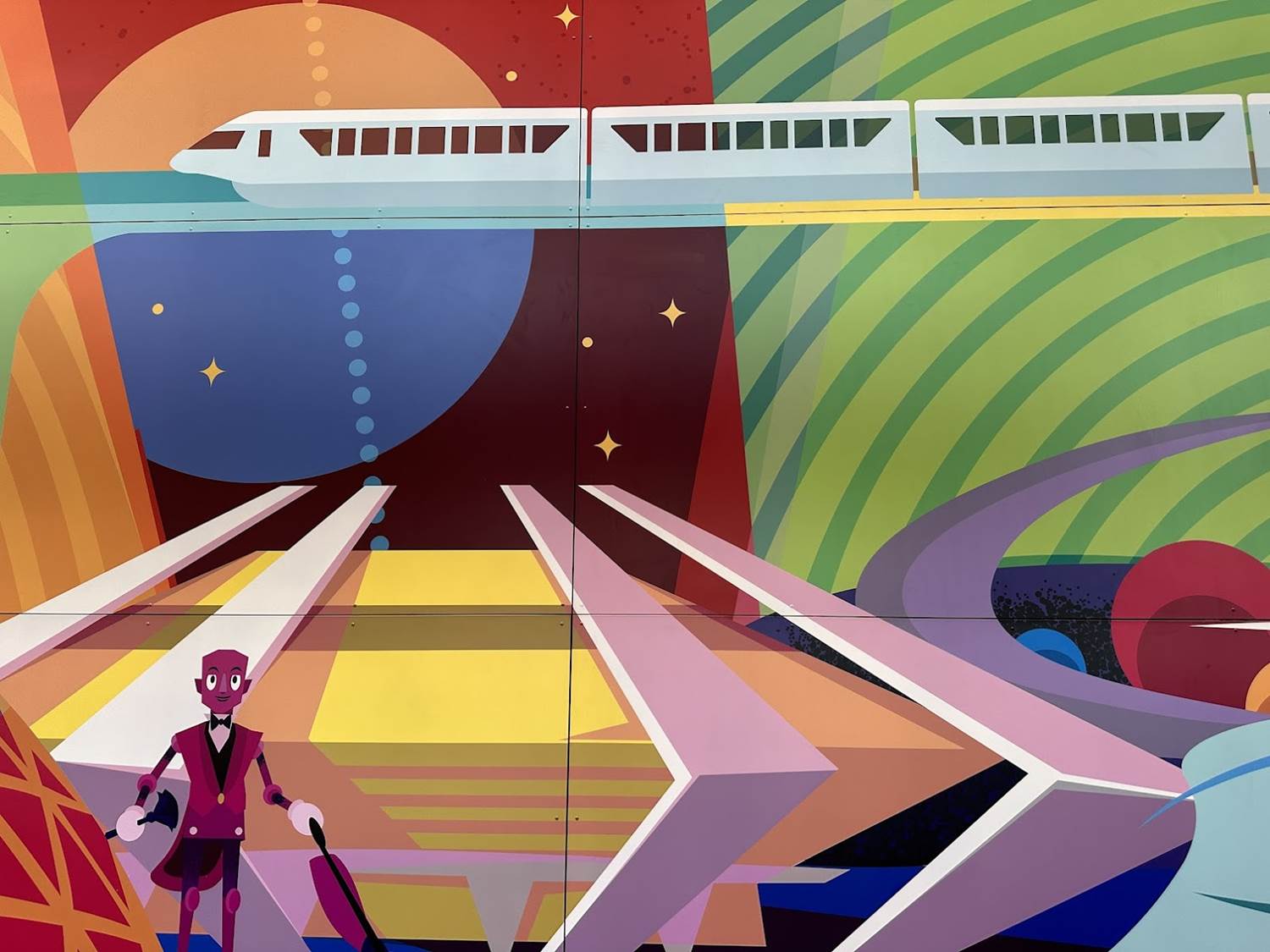 Wrapping alongside the side of the building is a gorgeous and colorful mural depicting some Disney friends and a look at EPCOT’s past and present. (I’m a personal fan of the Universe of Energy dino.)