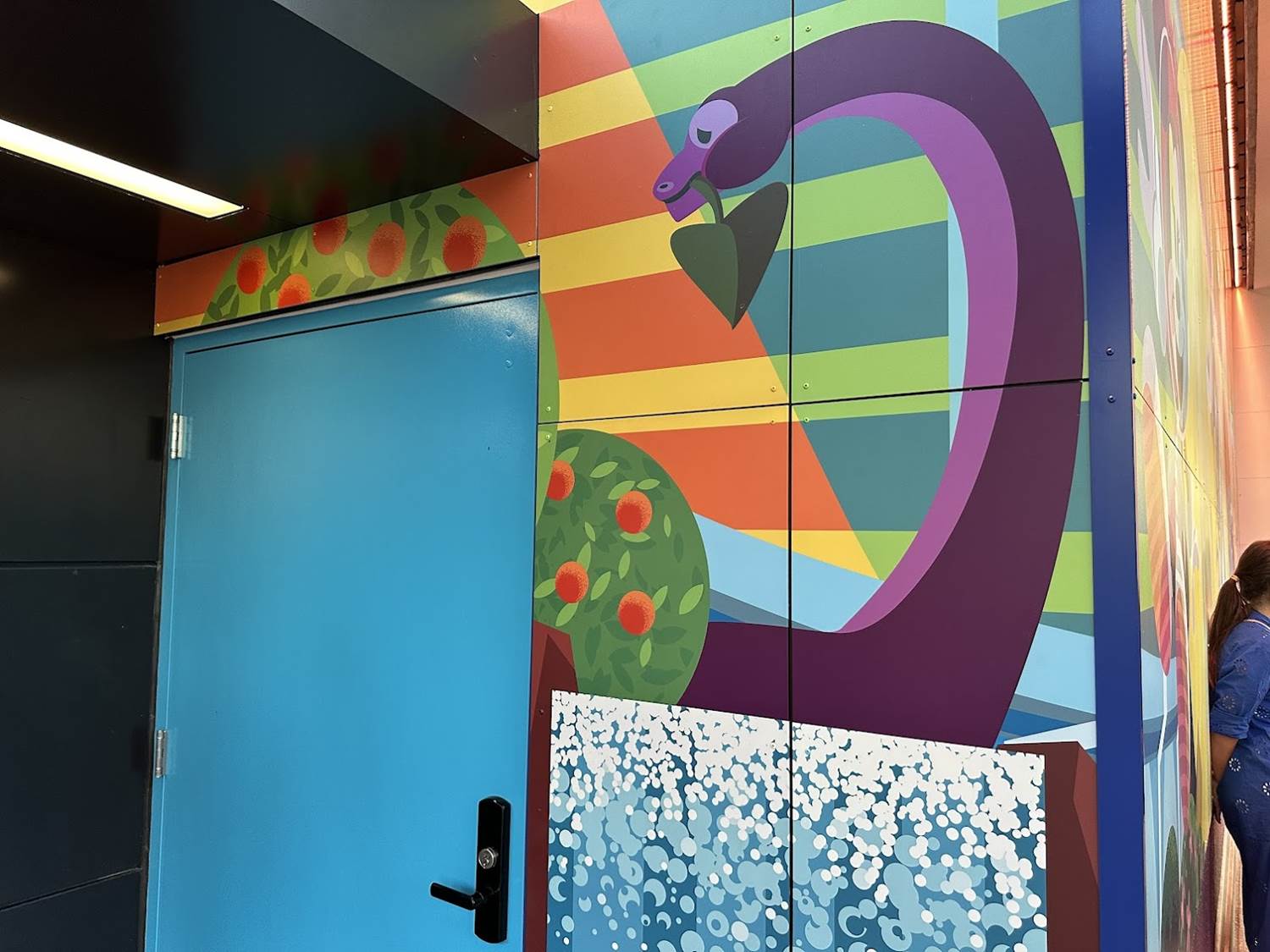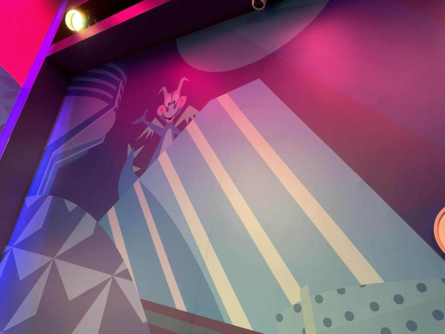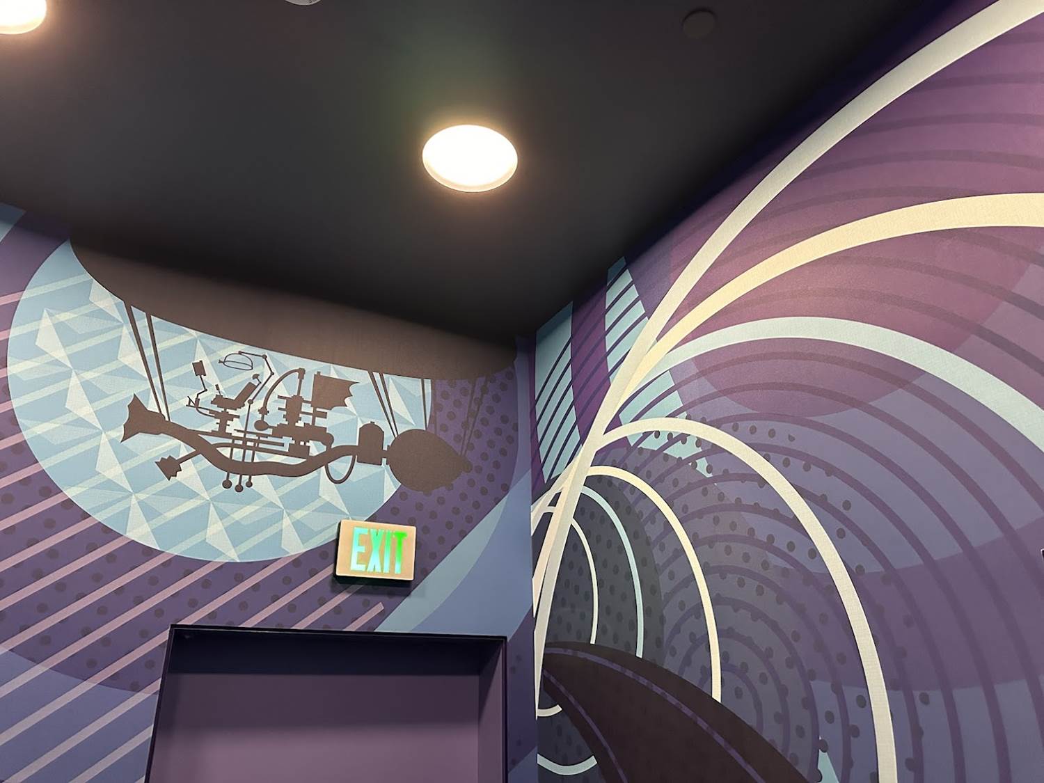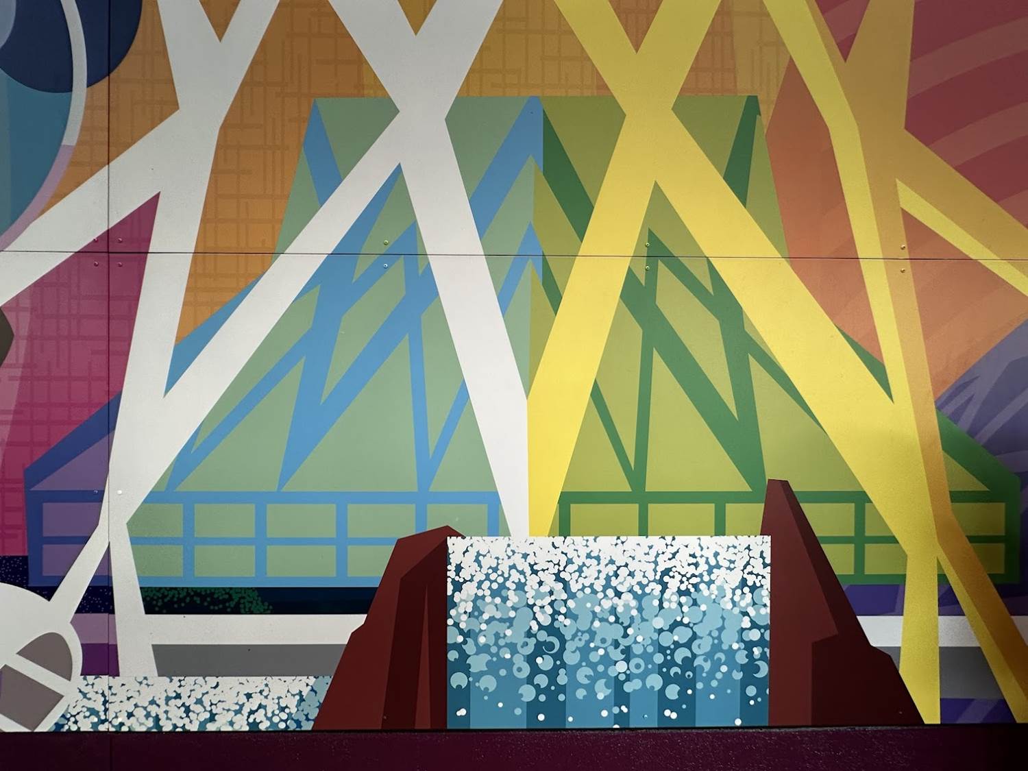 Wrapping alongside the side of the building is a gorgeous and colorful mural depicting some Disney friends and a look at EPCOT’s past and present. (I’m a personal fan of the Universe of Energy dino.)