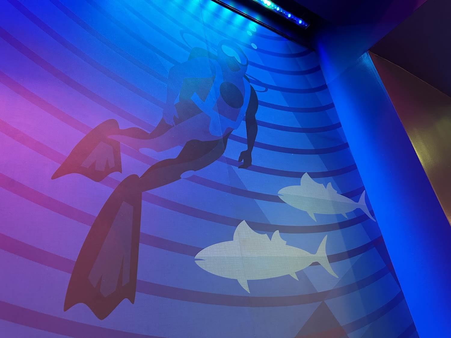The artwork style continues on the inside of the building, including the three backdrops for the characters.
