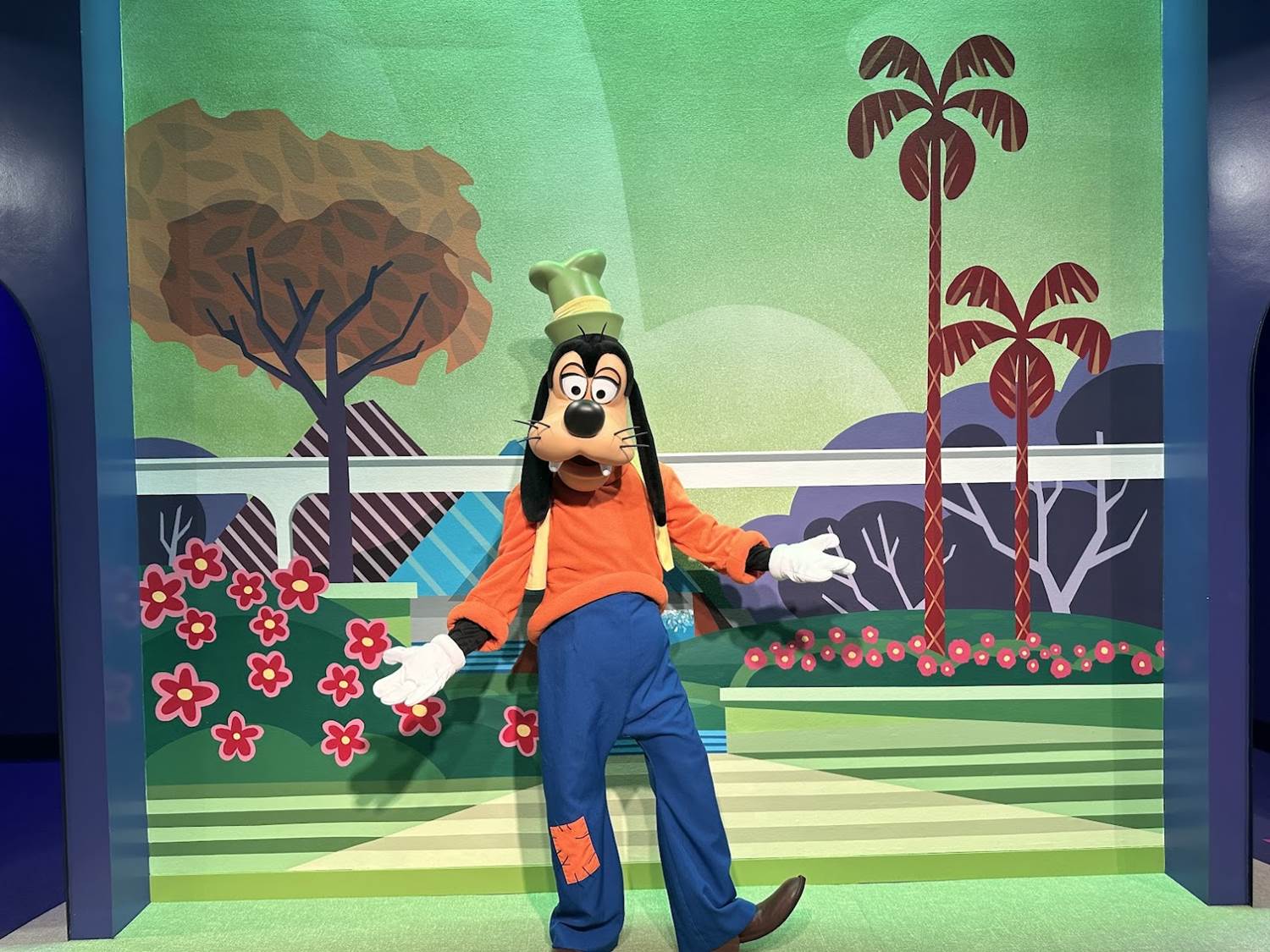 Mickey, Goofy, and Minnie are lined up for guests to meet all three against fun EPCOT-centric backdrops.