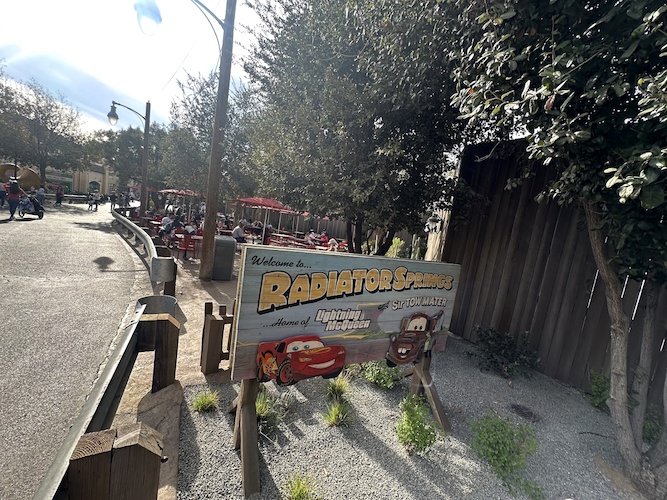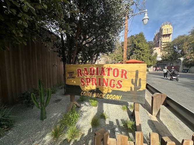 - On the side closest to Avengers Campus, a sign has been added at the entrance of the new eating area welcoming guests to Radiator Springs on one side and telling them to come back soon on the other.