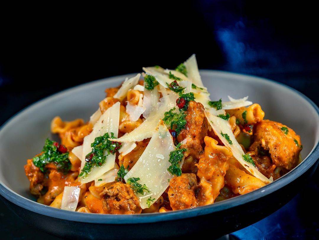 - Pepper Particle Pasta: Campanelli pasta topped with grilled chicken, spicy tomato cream sauce, chimichurri, and parmesan (seen above)