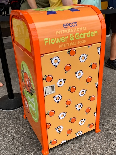- The trash can's door showcases a vibrant floral design in yellow, white, pink, and orange, while the lid displays the orange and blue logo of the 2025 EPCOT International Flower & Garden Festival.
