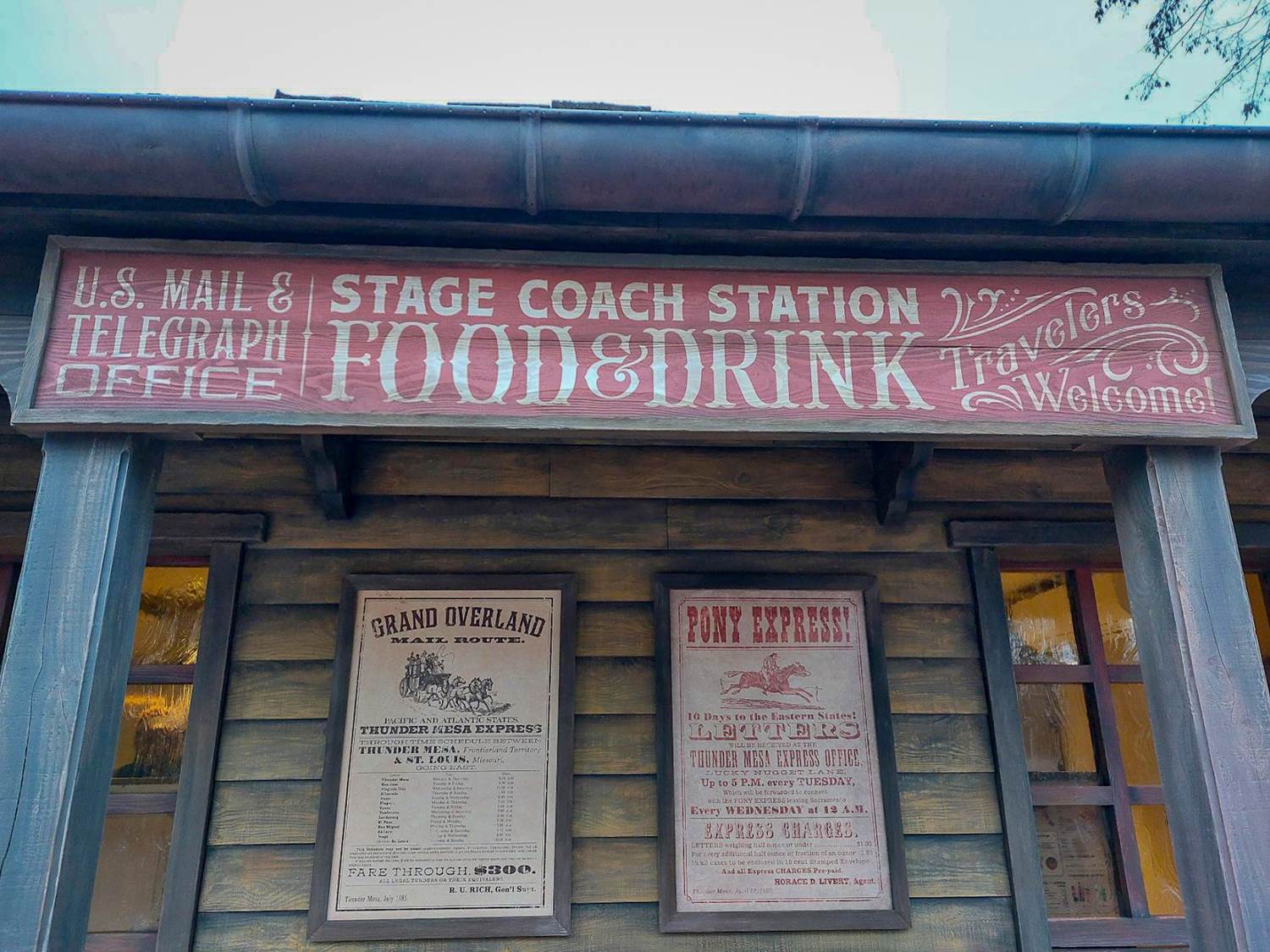 - The architecture of the kiosk blends the two main styles of the land's buildings, with the central part built in stone and wood, and the extremities in adobe, creating a natural transition between the Thunder Mesa entrance and the Pueblo-style facades, a blend typical of the Western films created in Europe, such as those by Sergio Leone. The wink doesn't stop there, as the list of stagecoach stops displayed on the kiosk's facade includes some of the most emblematic names of this beloved film genre.