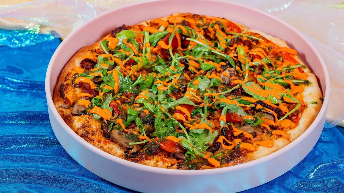 - Garden pizza with plant-based cheese, Romesco sauce, soy chorizo, cilantro-mint chimichurri, shaved asparagus, crimini mushroom and sun-dried tomato (Plant-based)