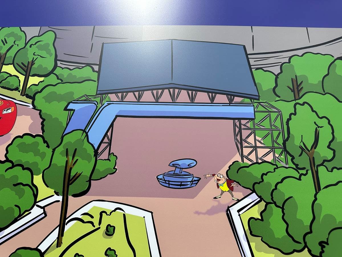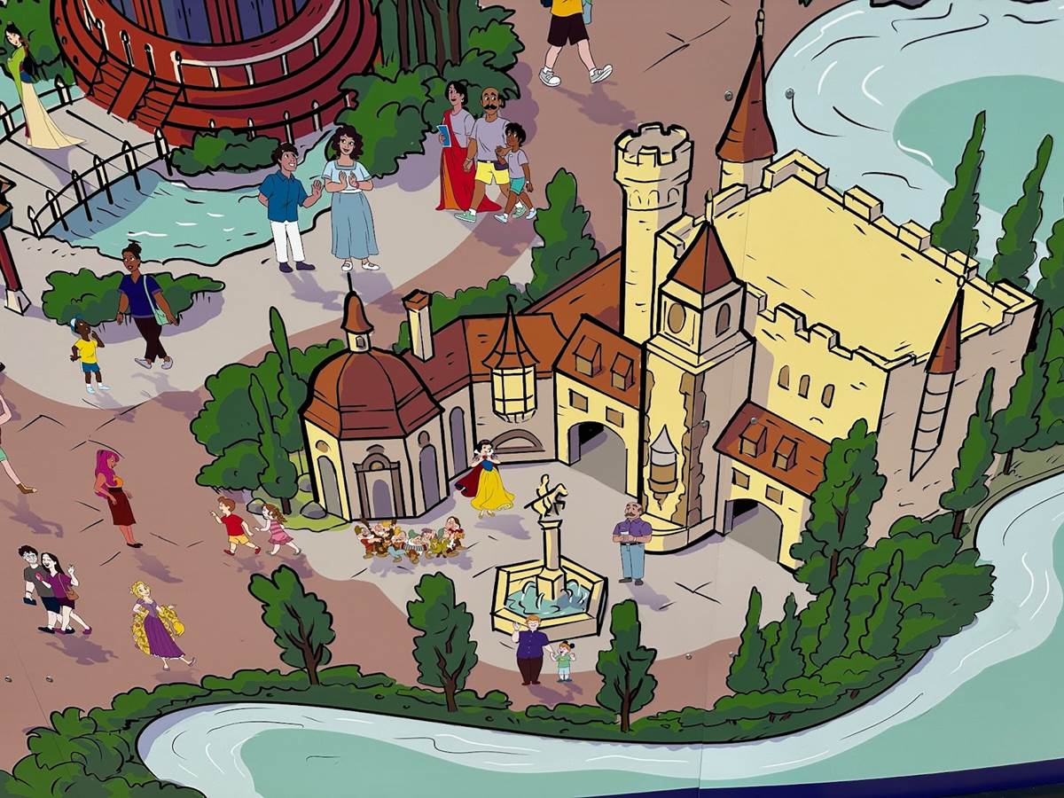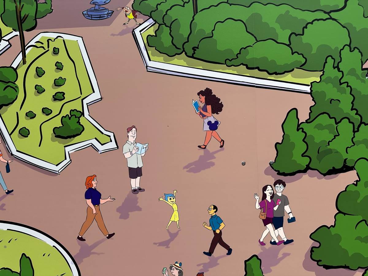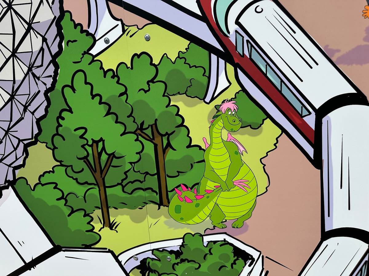The mural is located on the path leading from Journey into Imagination to World Showcase, near the restrooms. It is designed as a map of EPCOT, with 100 different characters sprinkled throughout.