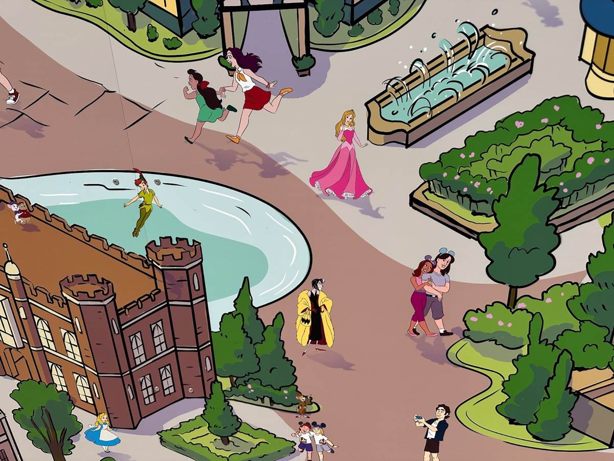 Heading towards the United Kingdom and France, we see Peter Pan, Cruella de Vil, Alice in Wonderland and Princess Aurora.