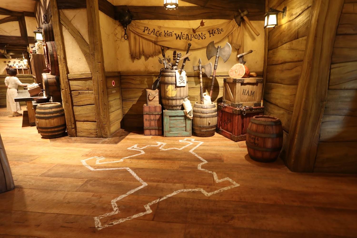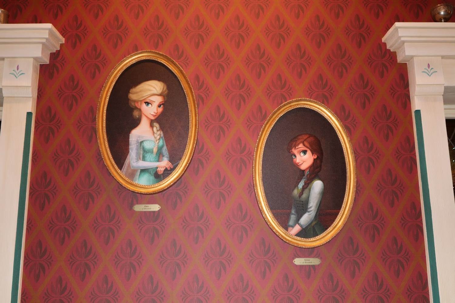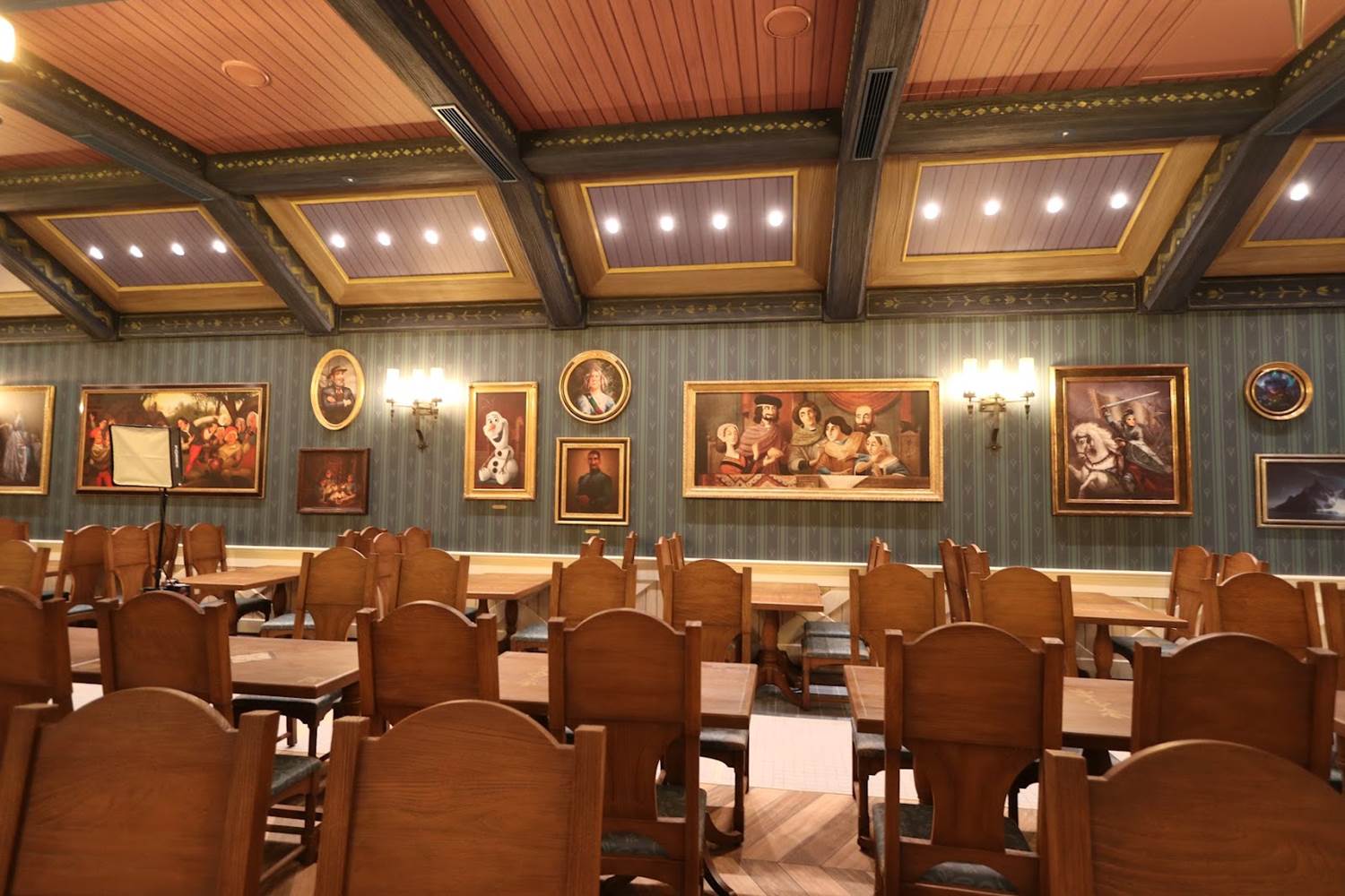 Inside the castle is the Royal Banquet Hall of Arendelle, the food and beverage location for the area. The dark woods add to the sense of pomp and circumstance for the dining location.