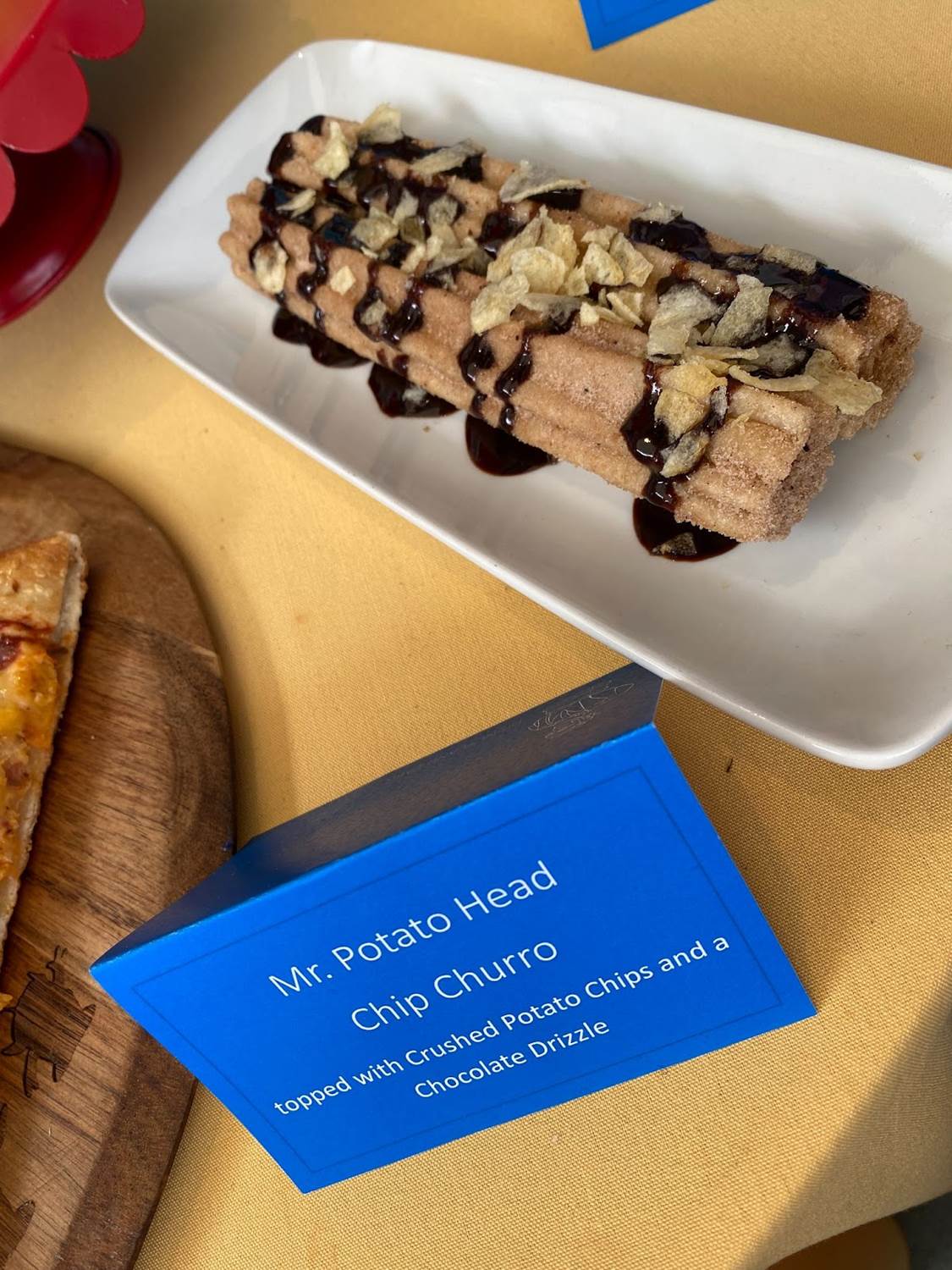 Mr. Potato Head serves as the inspiration for the Chip Churro (topped with crushed potato chips and a chocolate drizzle) available near Goofy’s Sky School.