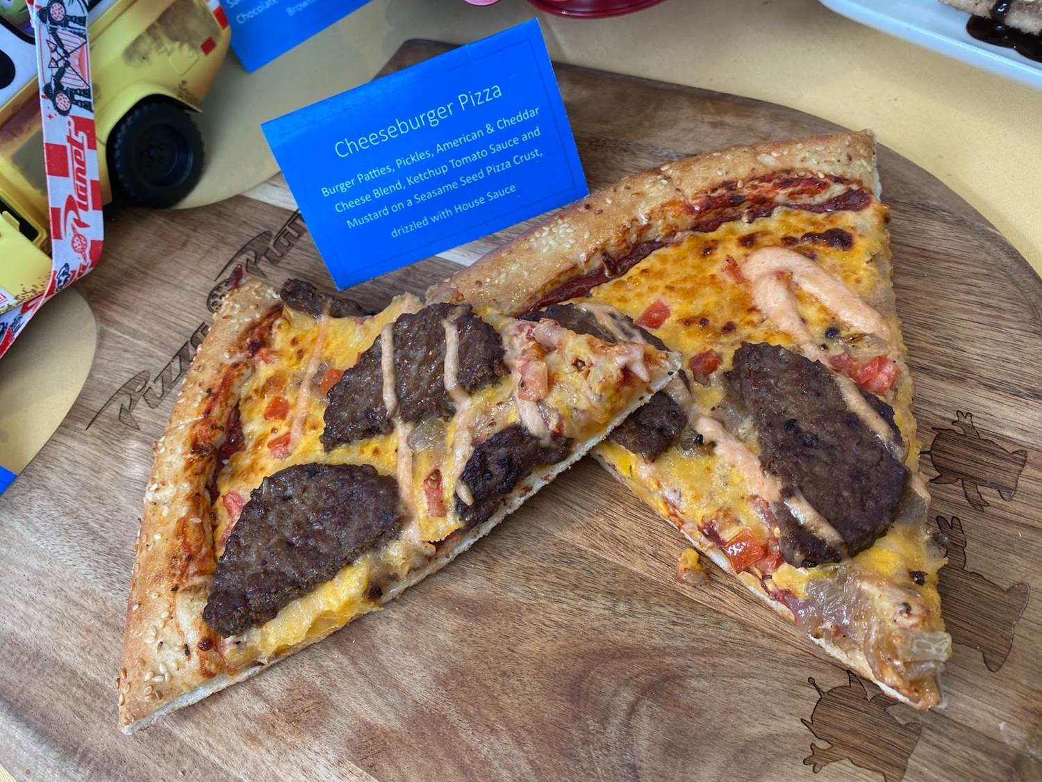 Also back on the menu is the Cheeseburger Pizza Slice (Burger patties, pickles, American & cheddar cheese blend, ketchup tomato sauce, and mustard on a sesame seed pizza crust drizzled with house sauce).