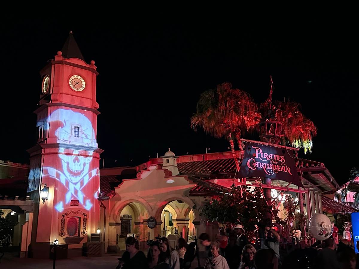 A Pirate skull dons a Santa hat over at Pirates of the Caribbean.