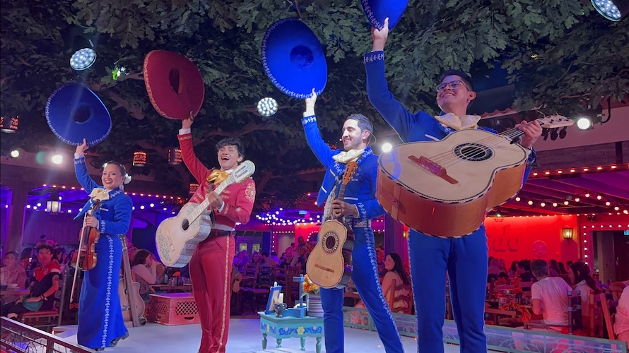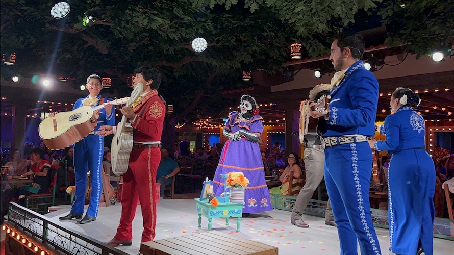 Plaza de Coco is the first theatrical dining experience themed to the Pixar Animation Studios film, Coco. This theater-in-the-round entertainment venue features dining tables surrounding a central stage, with performances and show effects that spread throughout the room.