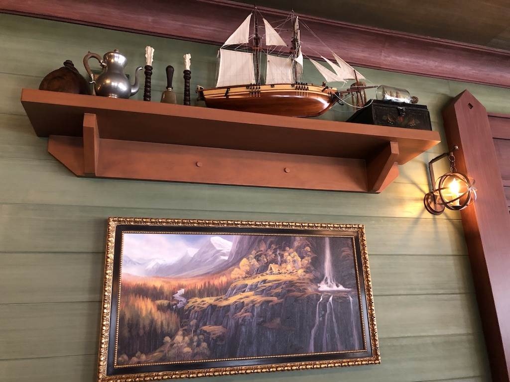 The decor in the restaurant includes a variety of interesting paintings showcasing ships, sea monsters, Arendelle, sailors like General Mattais, and dozens of nicknacks displayed on high shelves along the walls.