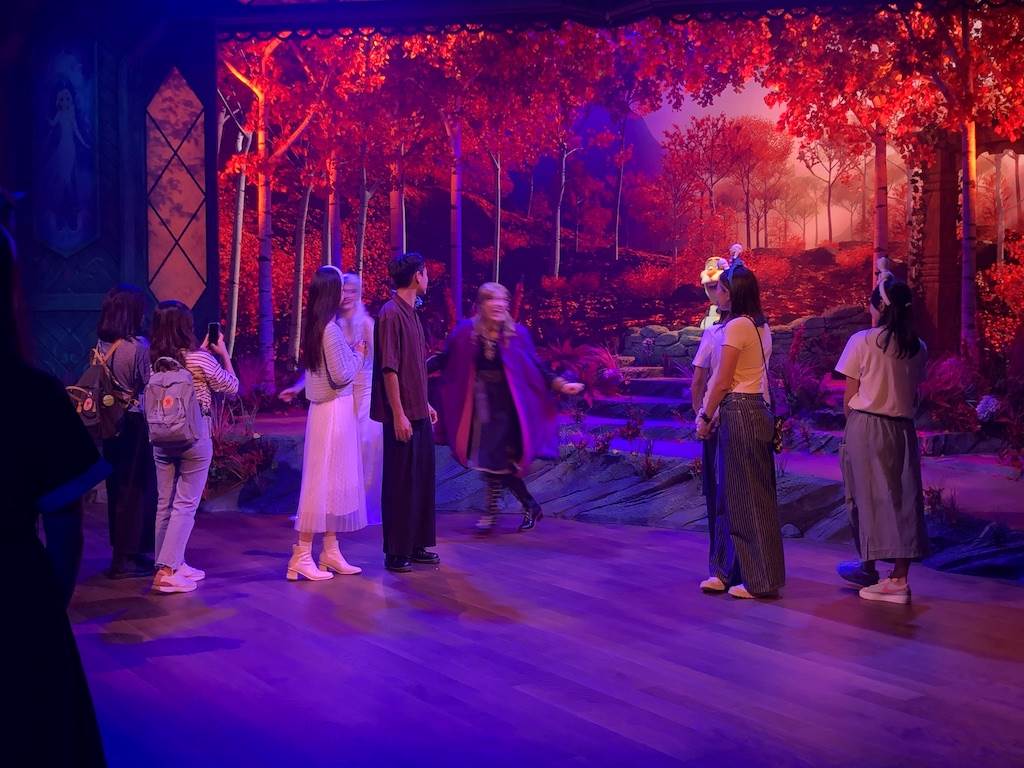 Playhouse in the Woods is a live, interactive, show that’s the first of its kind at Hong Kong Disneyland. The idea is that this is a special place where Elsa and Anna used to come and play and now as adults, they’re entertaining their new friends by sharing something from their childhood. The show is somewhat akin to Enchanted Tales with Belle at Magic Kingdom in Walt Disney World, but does not feature the same walk-through element (you know the effect I mean). Guests enter a large room with a stage at the back wall and plenty of space to wander around.