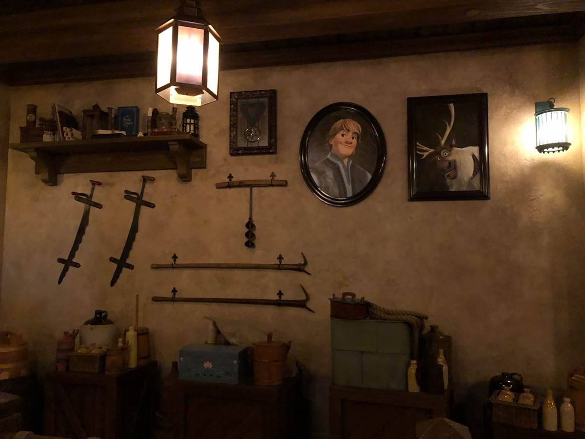 There’s also a display only staircase leading up the “inn" decorated with paintings of the royal family and a giant Arendelle Crest featuring Elsa and Anna’s portraits.