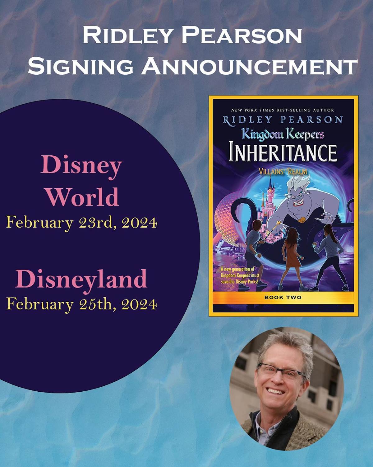 - Just a few days prior to the official release of the latest Kingdom Keepers book, Kingdom Keepers: Inheritance Book 2: Villains’ Realm, author Ridley Pearson will be appearing at the U.S. Disney Parks for signing appearances.