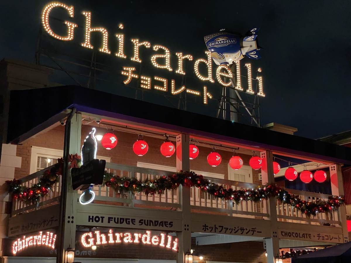 With the new Ghirardelli sign and the holiday garland, the land continues to shine as the night sky creeps in.