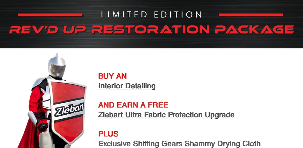 - As part of the promotion, if you purchase an interior detailing from Ziebart, you earn a free Ziebart Ultra Fabric Protection Upgrade, plus an exclusive Shifting Gears-branded shammy drying cloth.