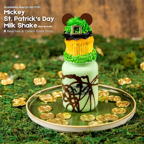 - Mickey St. Patrick's Day Milk Shake: Mint milk shake with chocolate drizzle, shamrock sprinkles, and a specialty vanilla cupcake – available March 1st-17th at Beaches & Cream Soda Shop at Disney’s Beach Club Resort