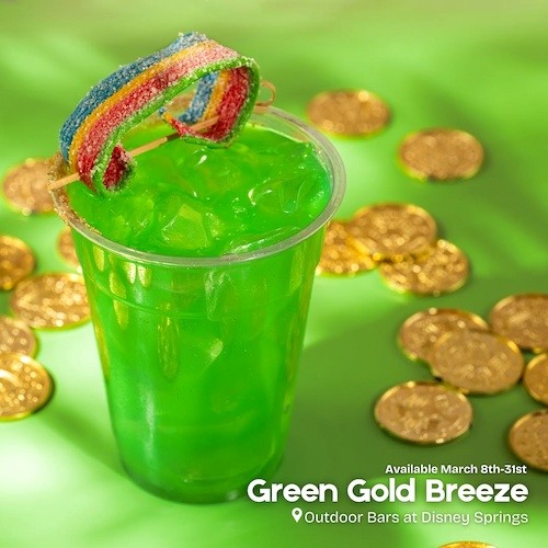 - Green Gold Breeze: Bacardí Silver Rum, Bols Blue Curaçao Liqueur, DOLE Pineapple Juice, Minute Maid Orange Juice, lime juice, and a candy garnish – available March 8th-31st at Disney Springs Outdoor Bars