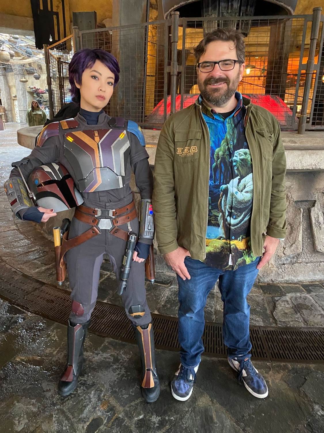 After Star Tours, it was up to the planet Batuu (in the immersive Star Wars: Galaxy’s Edge themed land) to meet Sabine Wren, a beloved character from Star Wars Rebels and Ahsoka making her first appearance in the area. I had seen Sabine at Disneyland After Dark: Star Wars Nite and aboard the Disney Cruise Line’s Star Wars Day at Sea previously, but considering this was her first visit to Black Spire Outpost it was cool to see her in this new context. Plus this version of the character has much nicer, more detailed armor, authentic-looking hair, and a performer that absolutely nailed her embodiment of the role. I have purist friends who don’t care to see characters that exist outside of the Galaxy’s Edge timeline (the period set between Episodes VIII and IX of the larger Star Wars canon) show up on Batuu, but I don’t have as much of a problem with it, and I’m mostly happy just to see fresh faces in the land.