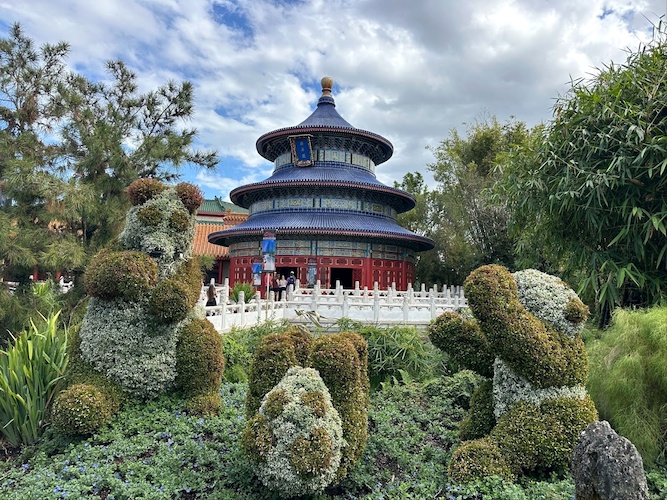 An embarrassment of panda topiaries (yes, that’s really what a group of pandas is called) have appeared at the China Pavilion.