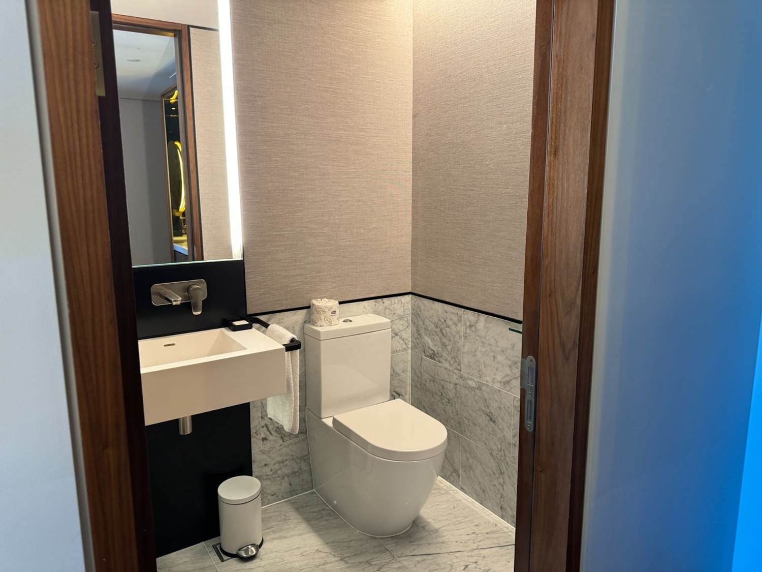 The toilet gets its own separate room, with a spacious walk-in closet separating the washroom from the bathroom.