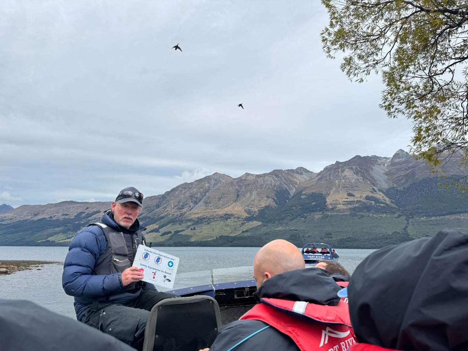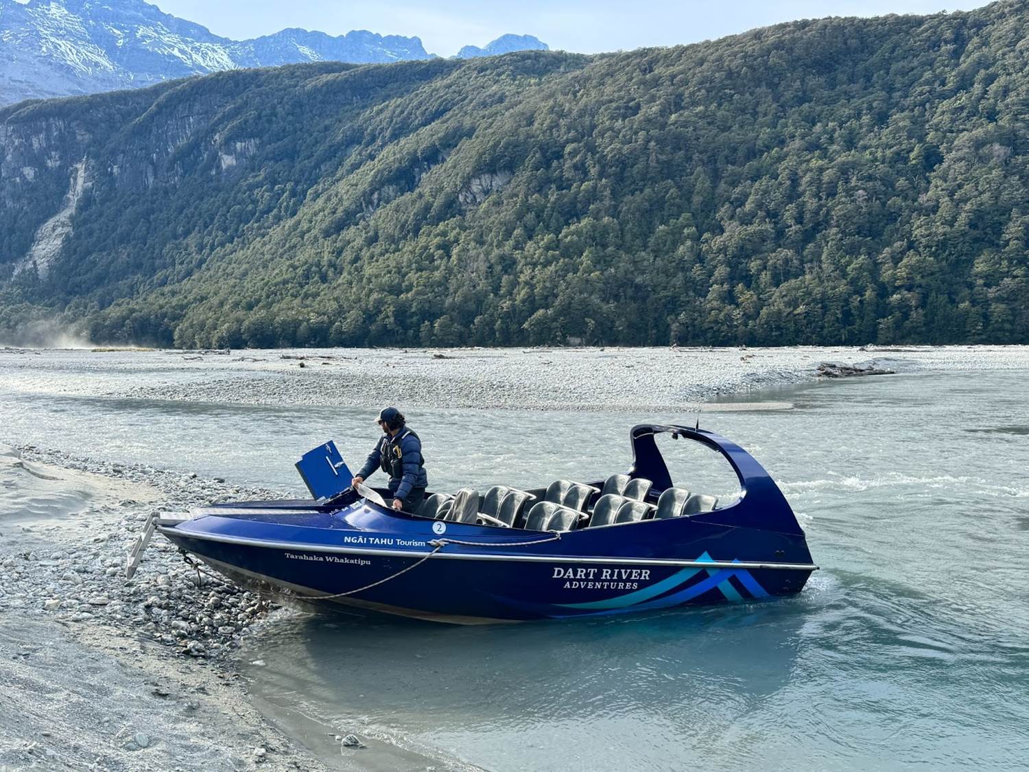 Before the Dart River Wilderness Jet Boat Tour, we were all outfitted with raincoats and life jackets, and given a neck gaiter. Glasses were recommended for the voyage. Our pilot also gave a thorough safety briefing before we ventured off into the braided, glacier-fed Dart River. With constantly changing river paths and lots of shallow banks, these high-speed, efficient boats made for a fun start to the day.