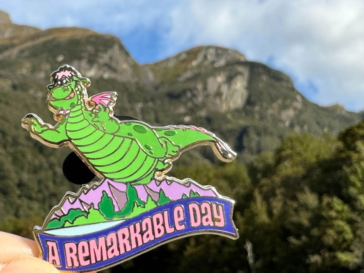 A Disney connection to the area also lead into the pin of the day. The 2016 remake of Pete’s Dragon was filmed in New Zealand, and these forested mountains served as Eliot’s home in the film. The day’s theme was “A Remarkable Day," featuring the original Elliott from the 1977 live-action/animated musical version of the story flying over these hills, a chain known as the Remarkable Mountains.