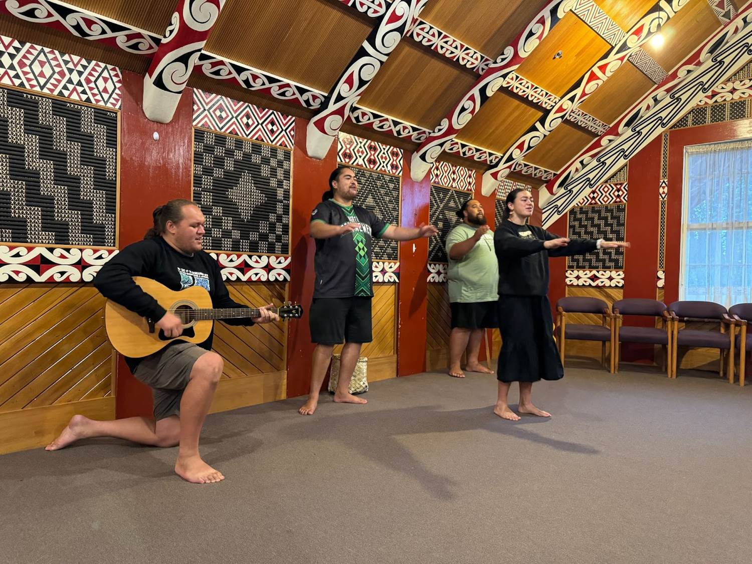 Their story has a happy ending, with Hinemoa eventually swimming to Mokoia Island to be with her true love. Today, most of the Māori people of Ōwhata marae can trace their ancestry back to Hinemoa and Tūtānekai, and we got to meet some of their ancestors, who gave us a traditional Māori welcome. After a traditional greeting, during which we were approved by the group, we were admitted into the wharenui (carved meeting house), which was named after Tūtānekai. We were treated to several songs and performances in addition to a Haka (war dance). After the performance, we were split into groups, with the men learning how to perform the Haka while the women learned how to spin poi (our first exposure to both traditions came on Day 2). After rehearsing in gender-split groups, we then came together to perform for each other.
