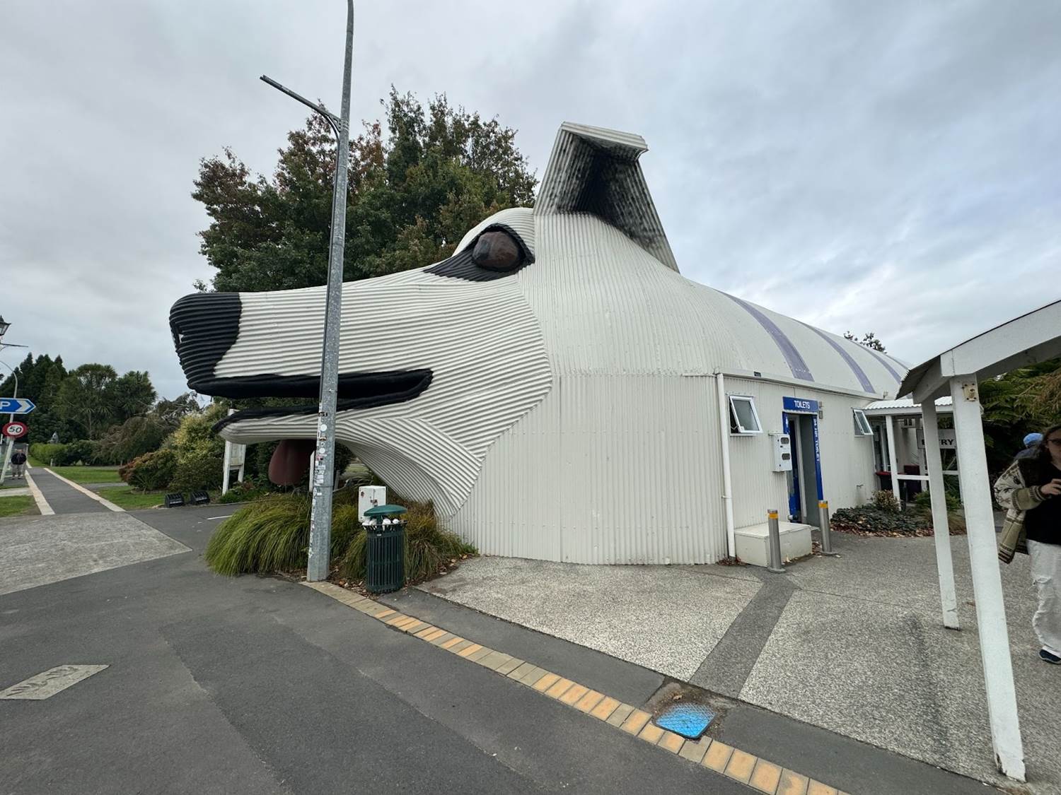 Back on the bust, we continued our trip to Rotorua, briefly stopping for another bathroom break in Tirau, the corrugated iron capital of New Zealand, which features buildings styled after animals like dogs and sheep.